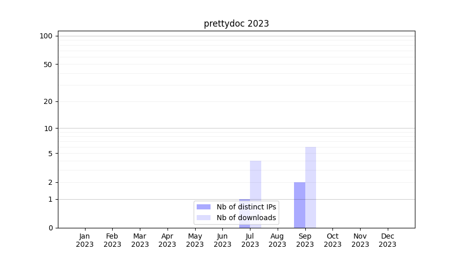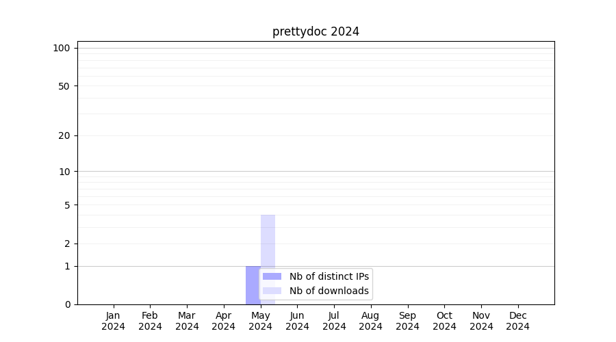 Number of downloads for experiment package prettydoc, year by year, from 2025 back to 2014 (years with no downloads are omitted):