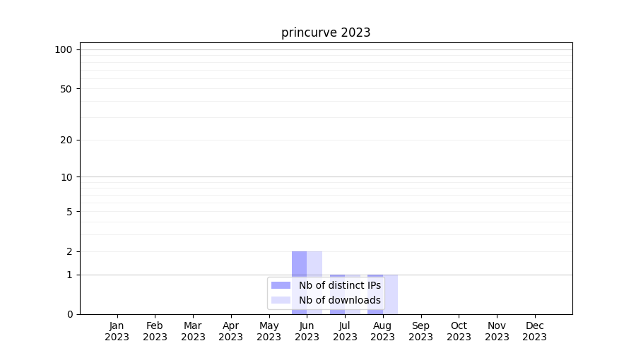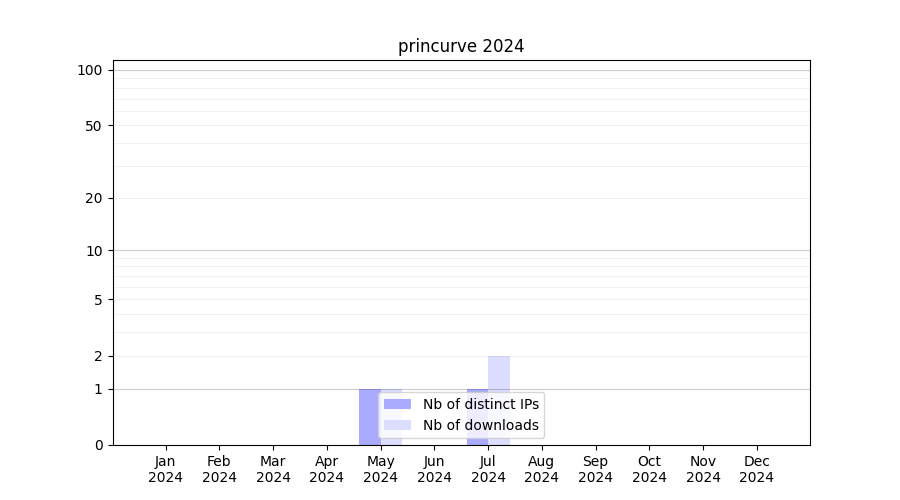 Number of downloads for experiment package princurve, year by year, from 2025 back to 2014 (years with no downloads are omitted):