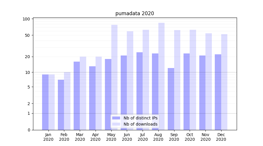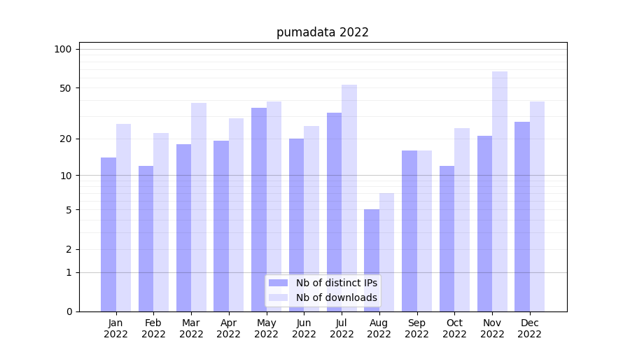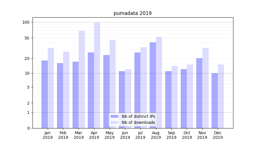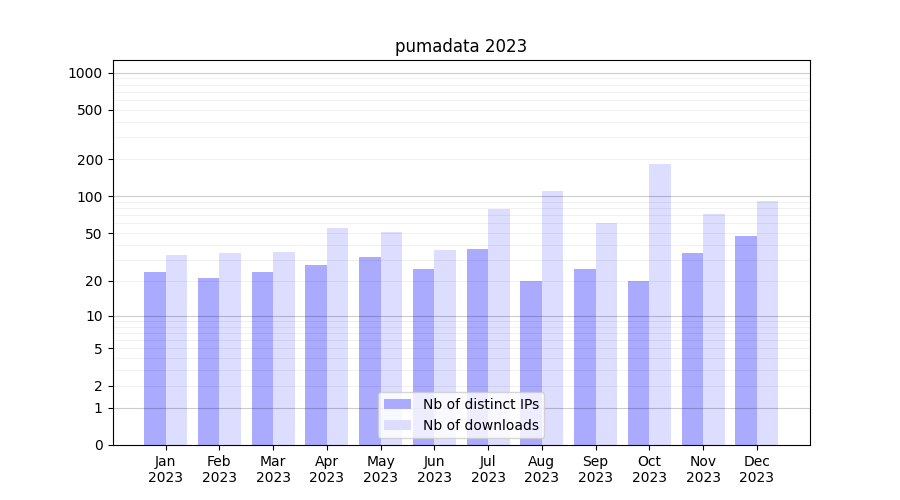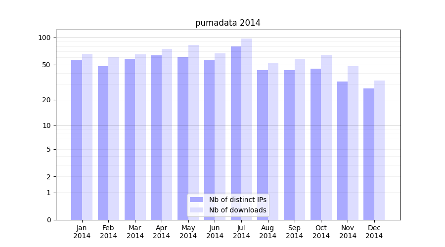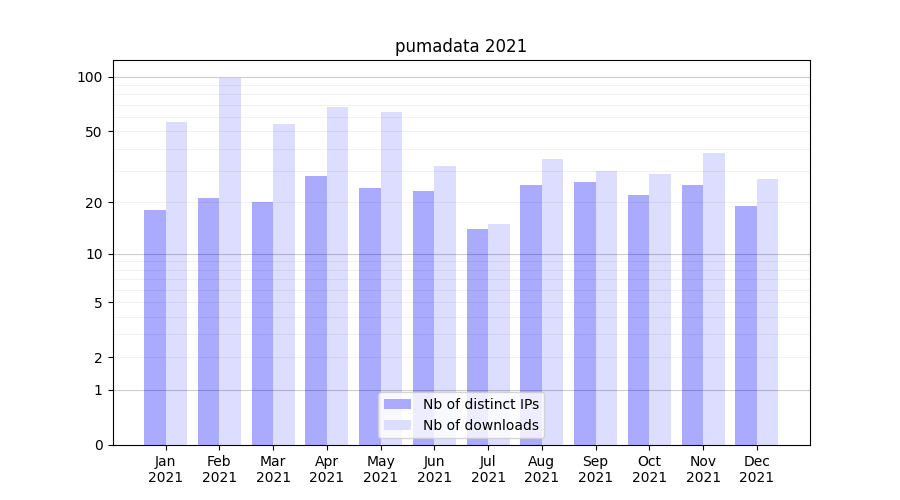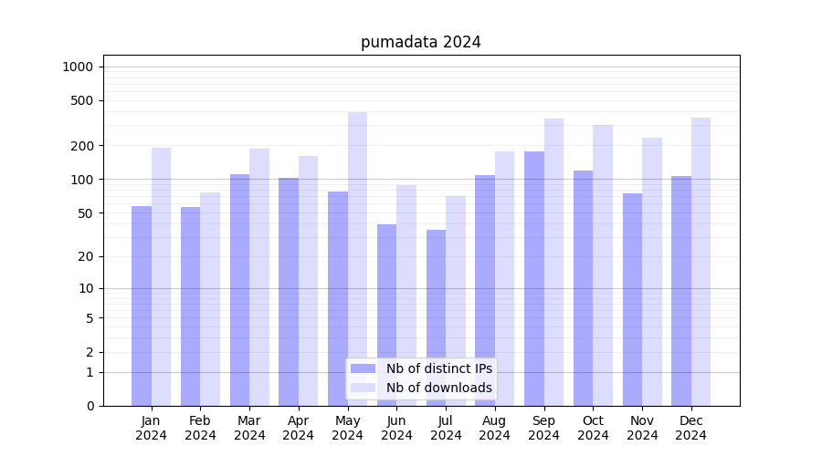 Number of downloads for experiment package pumadata, year by year, from 2025 back to 2014 (years with no downloads are omitted):