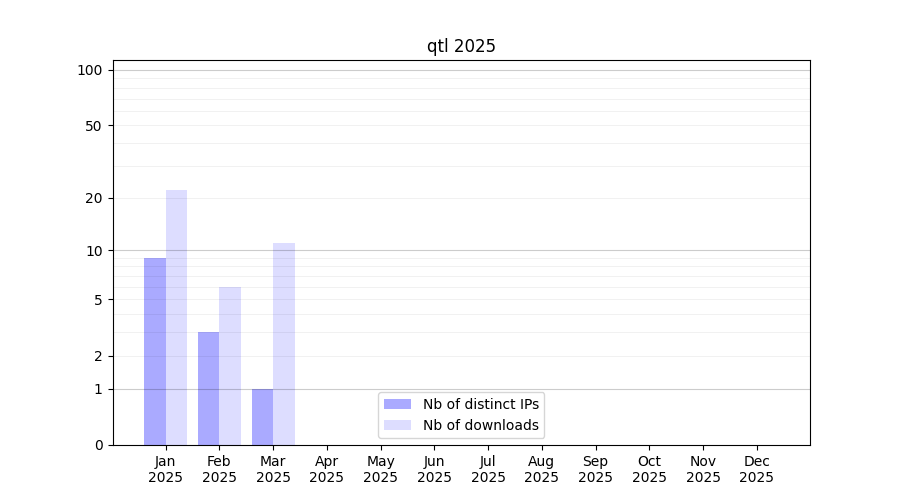 Number of downloads for experiment package qtl, year by year, from 2025 back to 2014 (years with no downloads are omitted):