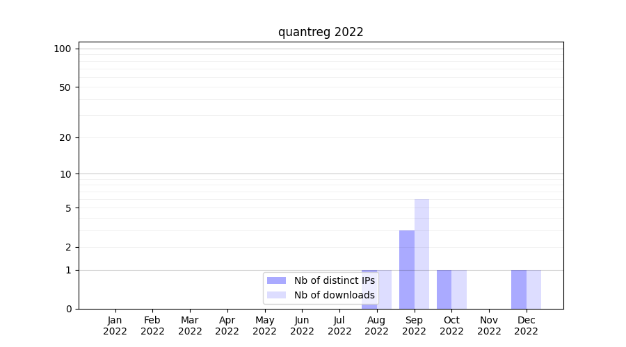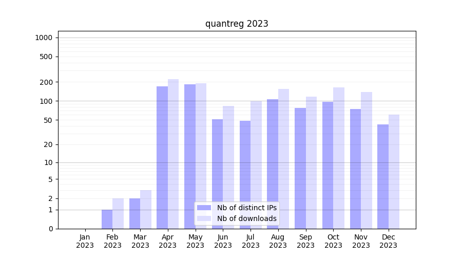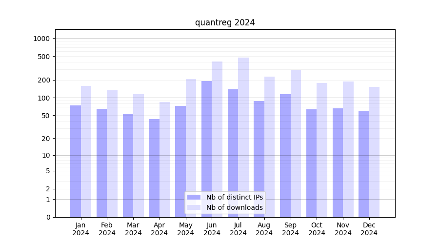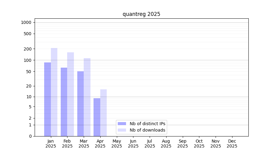 Number of downloads for experiment package quantreg, year by year, from 2025 back to 2014 (years with no downloads are omitted):