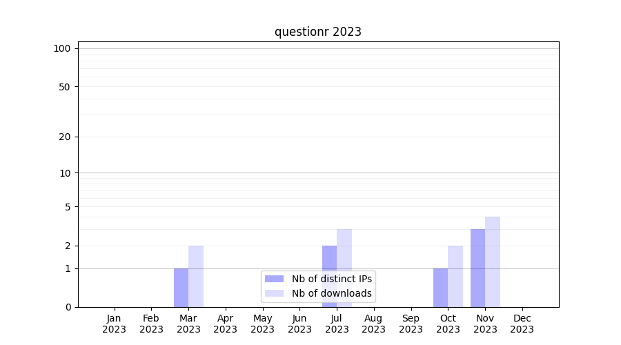 Number of downloads for experiment package questionr, year by year, from 2025 back to 2014 (years with no downloads are omitted):