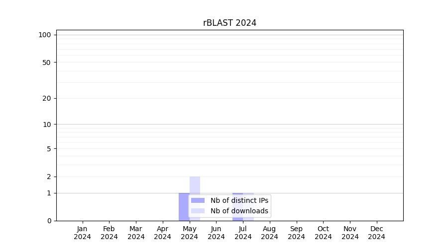 Number of downloads for experiment package rBLAST, year by year, from 2025 back to 2014 (years with no downloads are omitted):