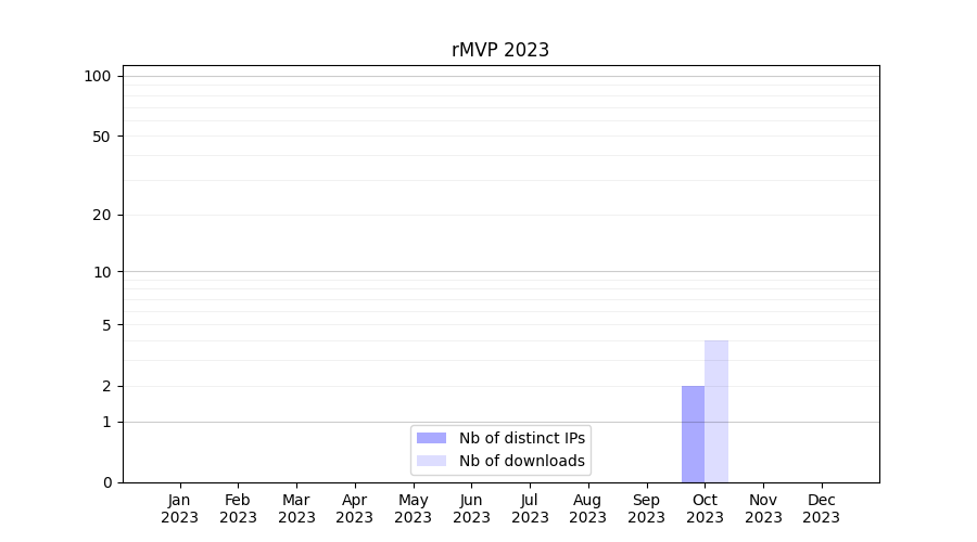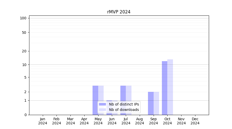 Number of downloads for experiment package rMVP, year by year, from 2025 back to 2014 (years with no downloads are omitted):