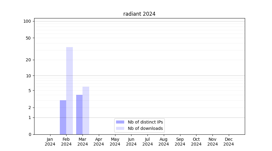 Number of downloads for experiment package radiant, year by year, from 2025 back to 2014 (years with no downloads are omitted):