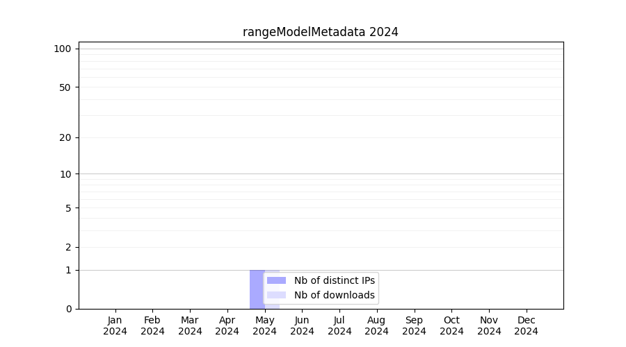 Number of downloads for experiment package rangeModelMetadata, year by year, from 2025 back to 2014 (years with no downloads are omitted):