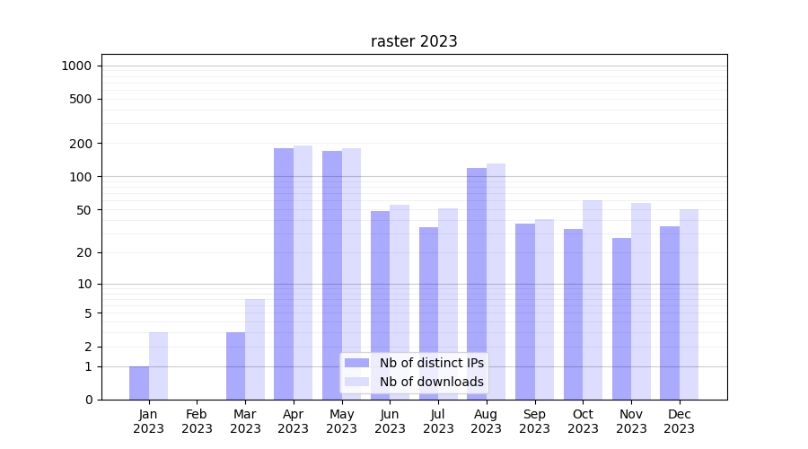 Number of downloads for experiment package raster, year by year, from 2025 back to 2014 (years with no downloads are omitted):