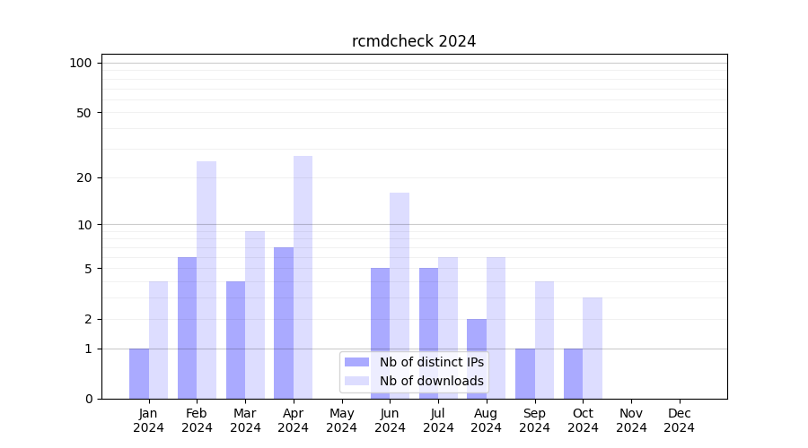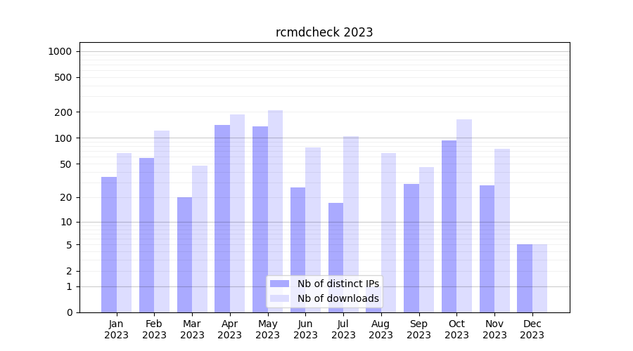 Number of downloads for experiment package rcmdcheck, year by year, from 2025 back to 2014 (years with no downloads are omitted):