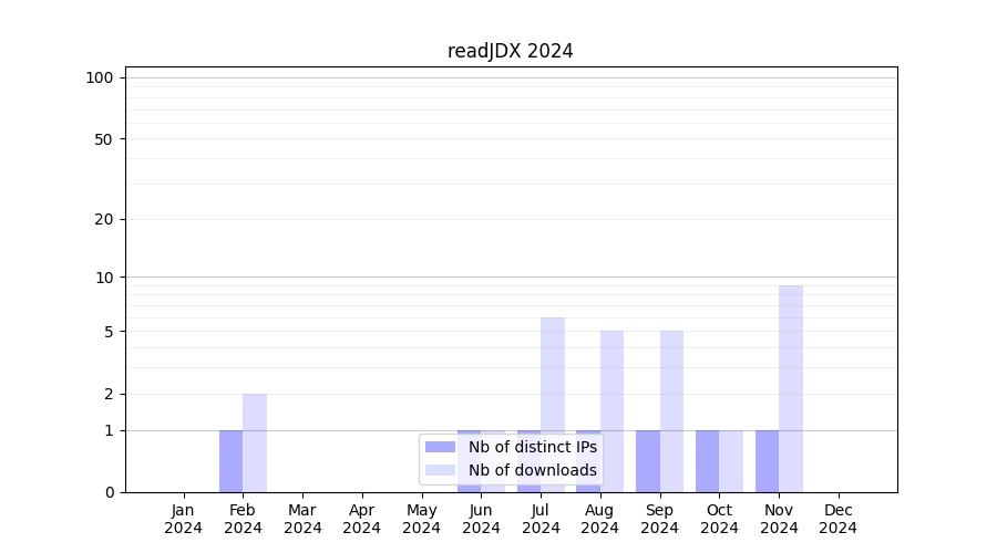 Number of downloads for experiment package readJDX, year by year, from 2025 back to 2014 (years with no downloads are omitted):