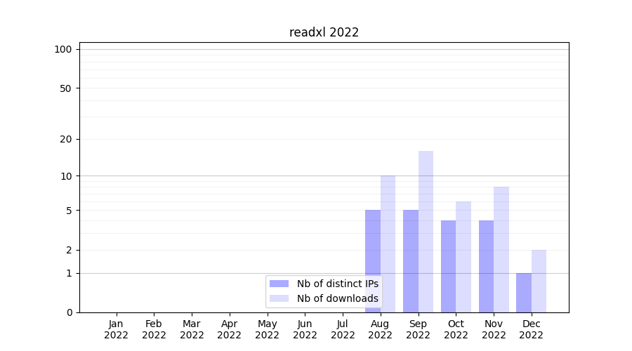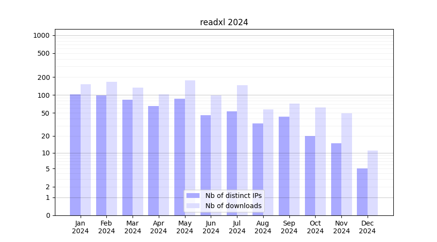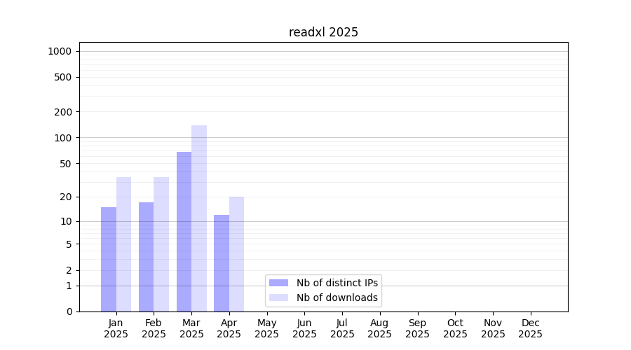 Number of downloads for experiment package readxl, year by year, from 2025 back to 2014 (years with no downloads are omitted):
