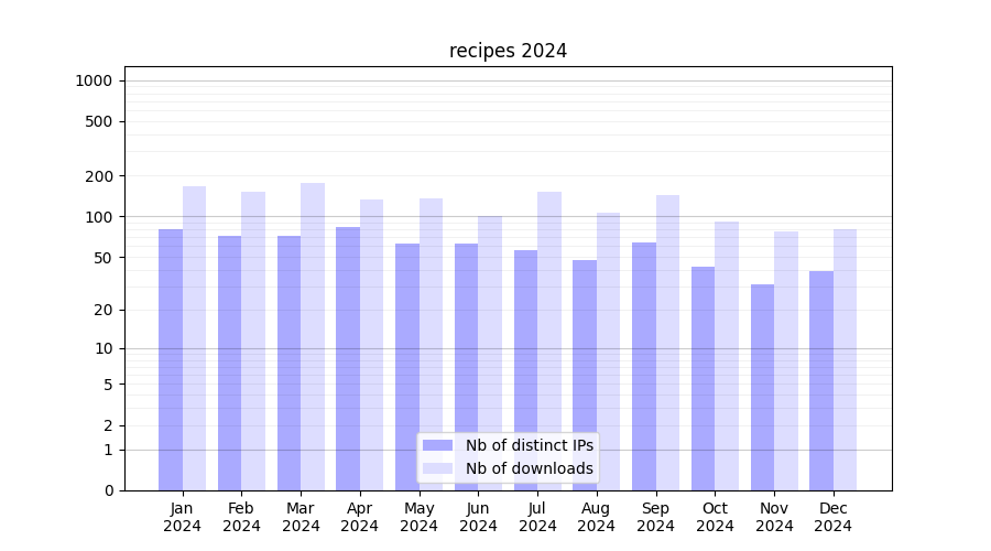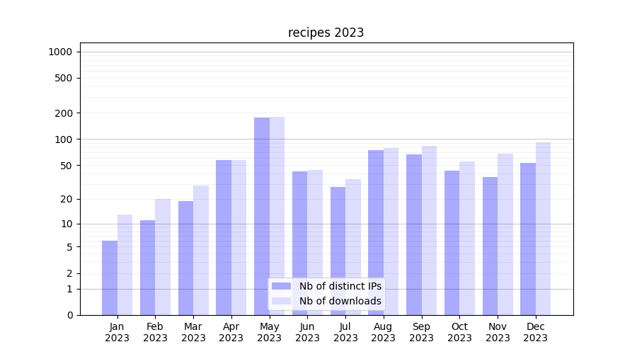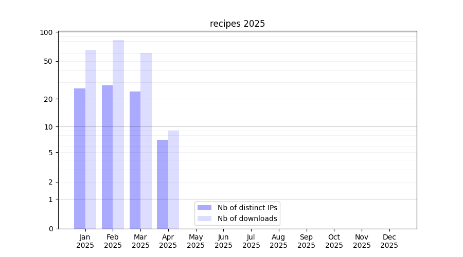 Number of downloads for experiment package recipes, year by year, from 2025 back to 2014 (years with no downloads are omitted):
