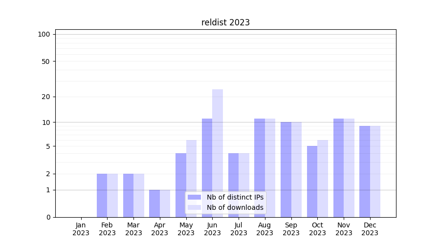 Number of downloads for experiment package reldist, year by year, from 2025 back to 2014 (years with no downloads are omitted):