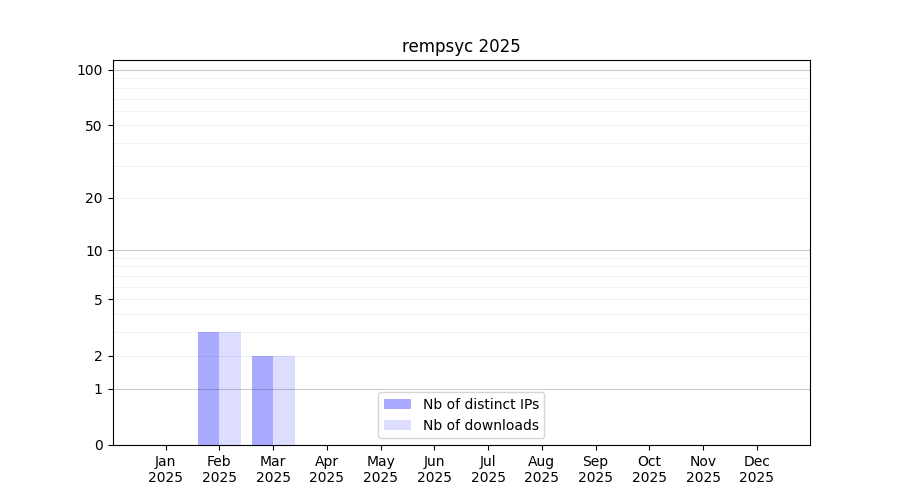 Number of downloads for experiment package rempsyc, year by year, from 2025 back to 2014 (years with no downloads are omitted):