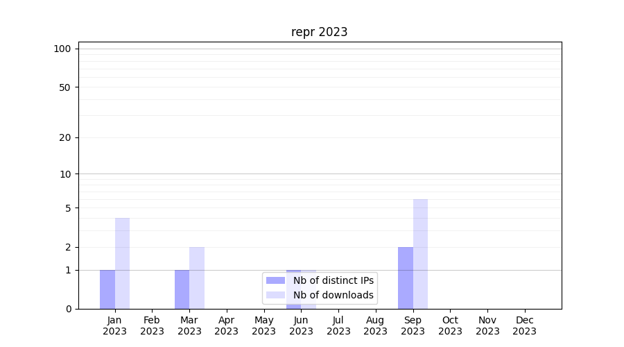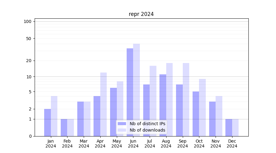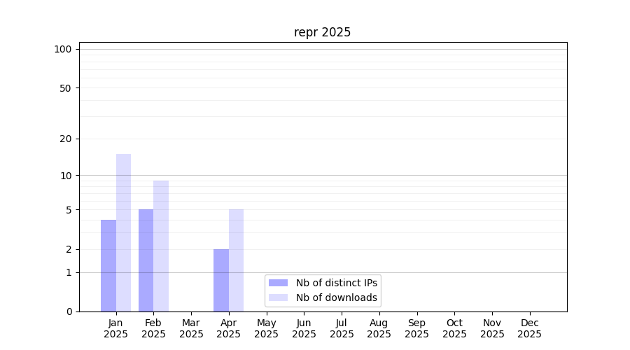 Number of downloads for experiment package repr, year by year, from 2025 back to 2014 (years with no downloads are omitted):