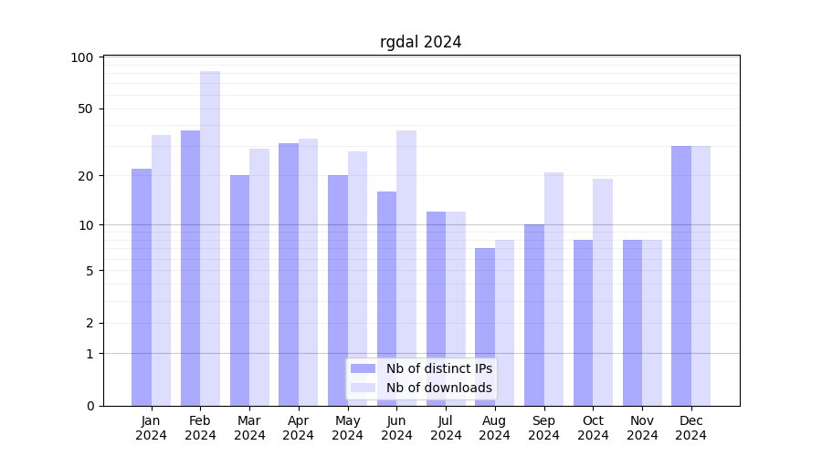 Number of downloads for experiment package rgdal, year by year, from 2025 back to 2014 (years with no downloads are omitted):