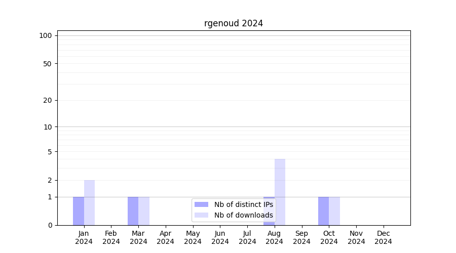 Number of downloads for experiment package rgenoud, year by year, from 2025 back to 2014 (years with no downloads are omitted):