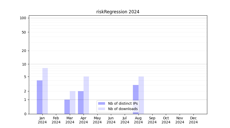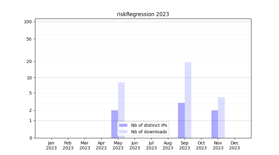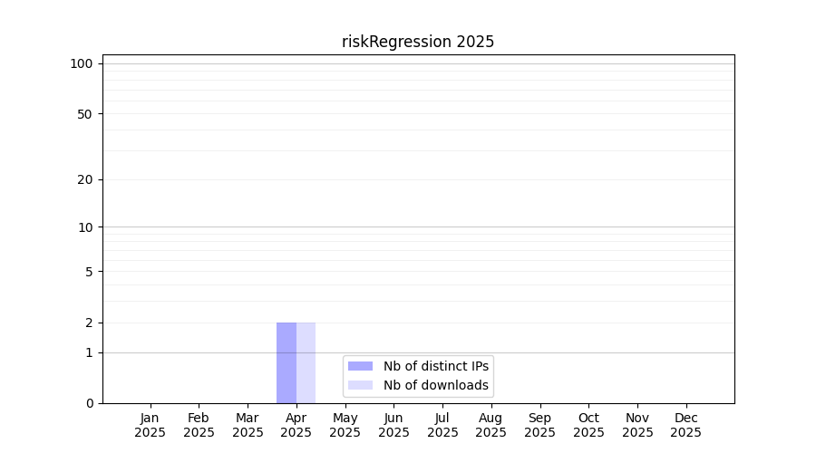 Number of downloads for experiment package riskRegression, year by year, from 2025 back to 2014 (years with no downloads are omitted):
