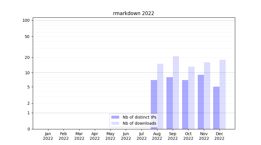 Number of downloads for experiment package rmarkdown, year by year, from 2025 back to 2014 (years with no downloads are omitted):