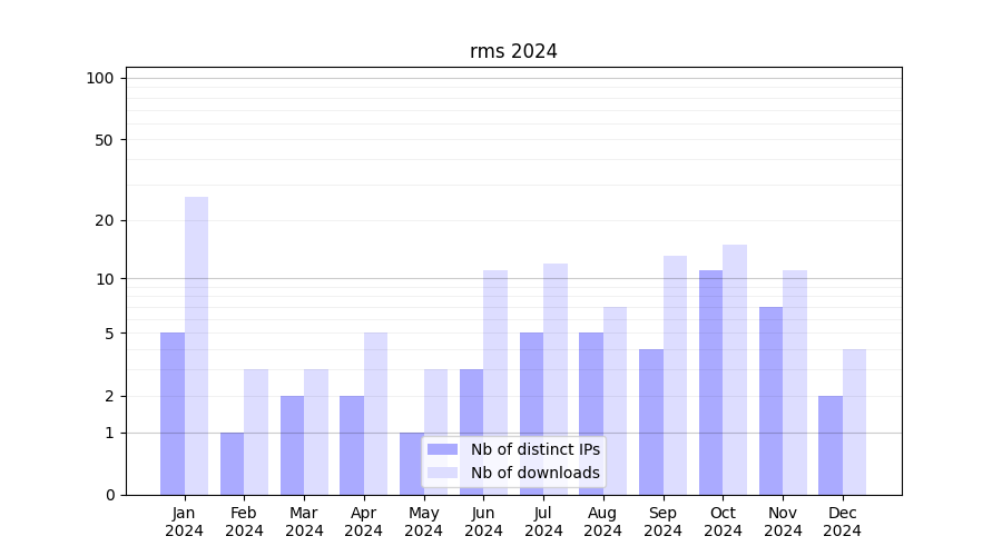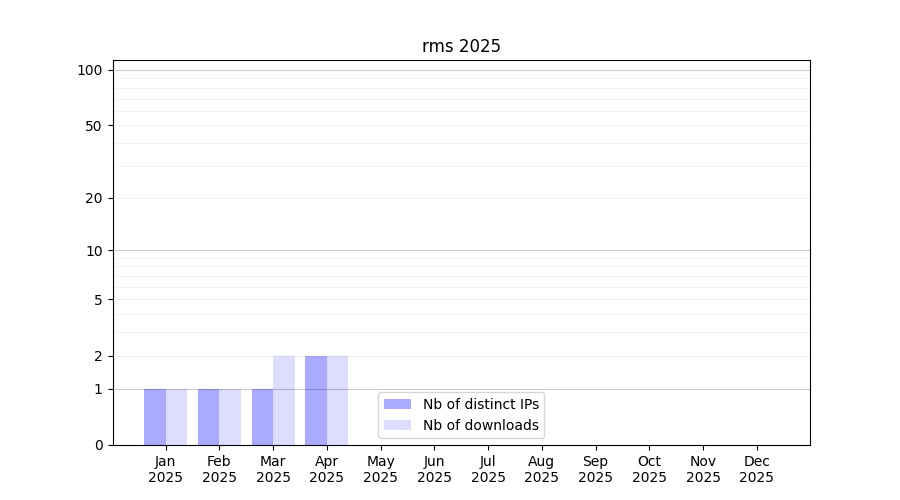 Number of downloads for experiment package rms, year by year, from 2025 back to 2014 (years with no downloads are omitted):