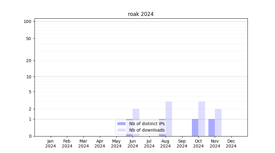 Number of downloads for experiment package roak, year by year, from 2025 back to 2014 (years with no downloads are omitted):
