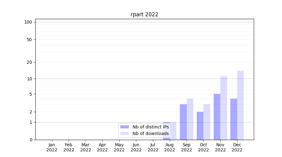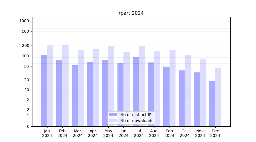 Number of downloads for experiment package rpart, year by year, from 2025 back to 2014 (years with no downloads are omitted):