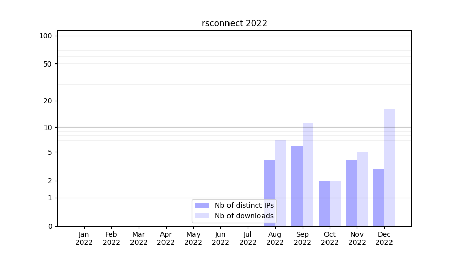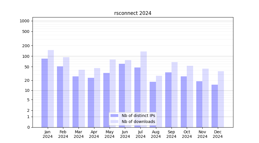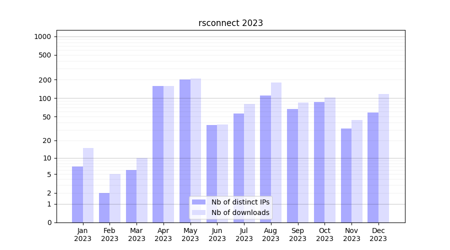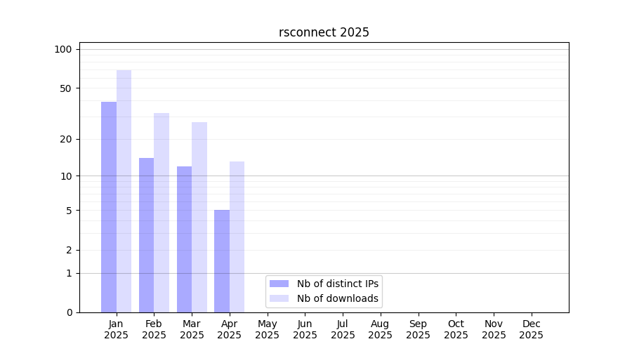 Number of downloads for experiment package rsconnect, year by year, from 2025 back to 2014 (years with no downloads are omitted):