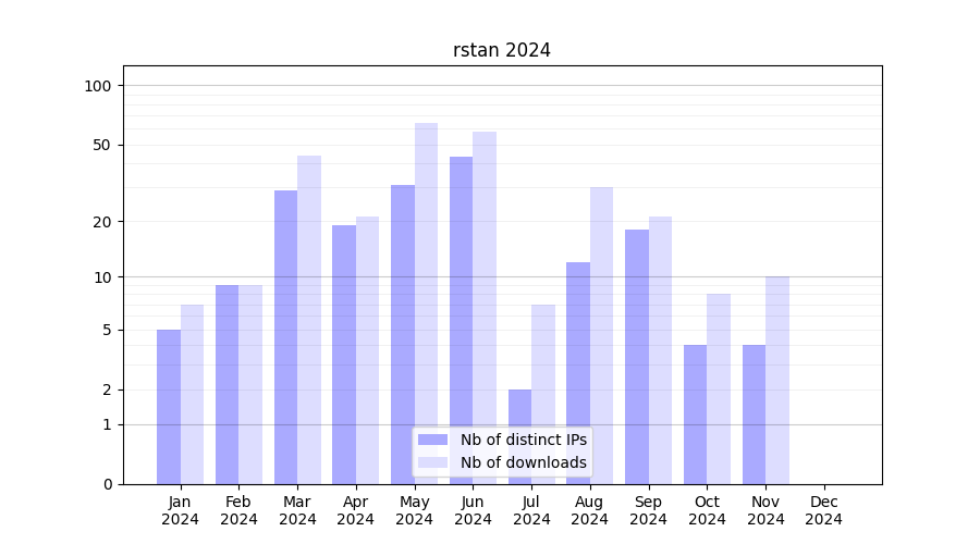 Number of downloads for experiment package rstan, year by year, from 2025 back to 2014 (years with no downloads are omitted):