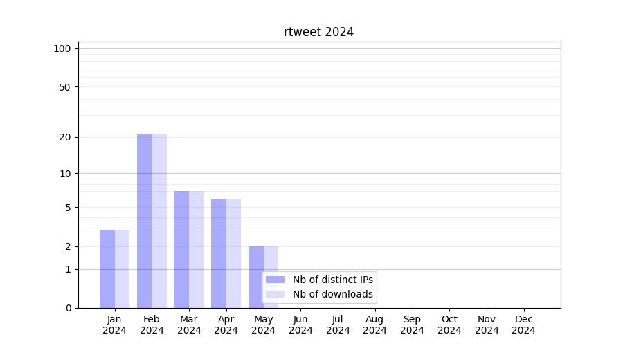 Number of downloads for experiment package rtweet, year by year, from 2025 back to 2014 (years with no downloads are omitted):