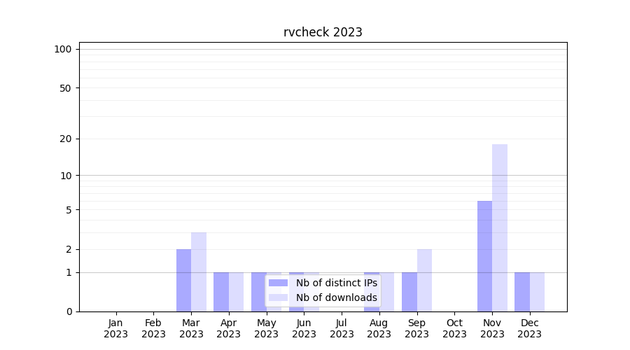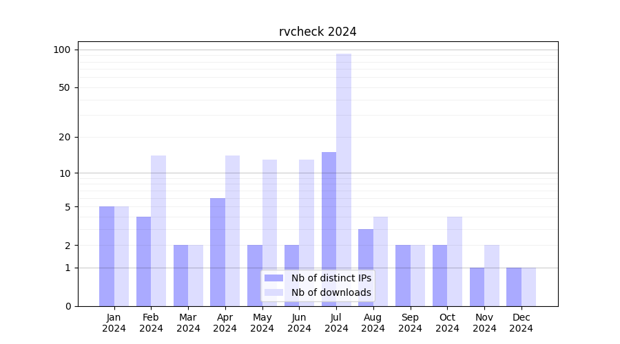 Number of downloads for experiment package rvcheck, year by year, from 2025 back to 2014 (years with no downloads are omitted):