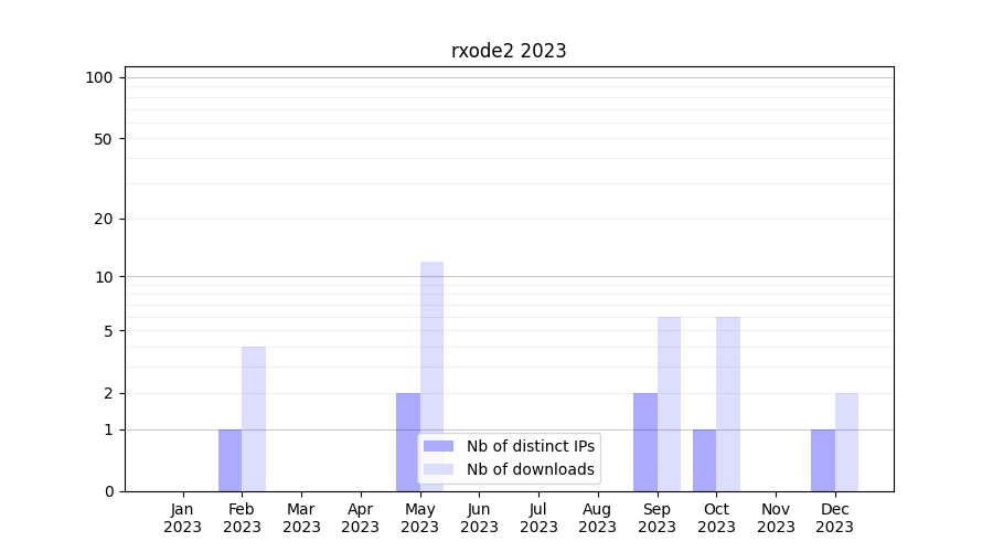 Number of downloads for experiment package rxode2, year by year, from 2025 back to 2014 (years with no downloads are omitted):