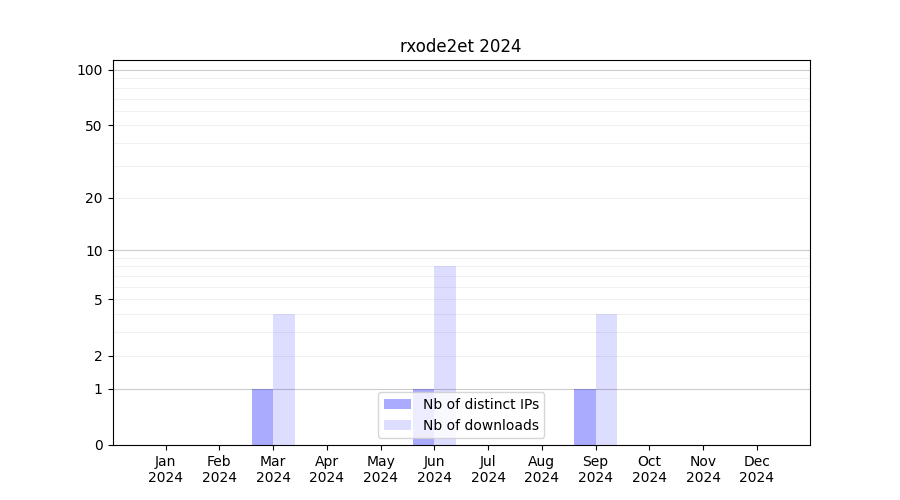 Number of downloads for experiment package rxode2et, year by year, from 2025 back to 2014 (years with no downloads are omitted):