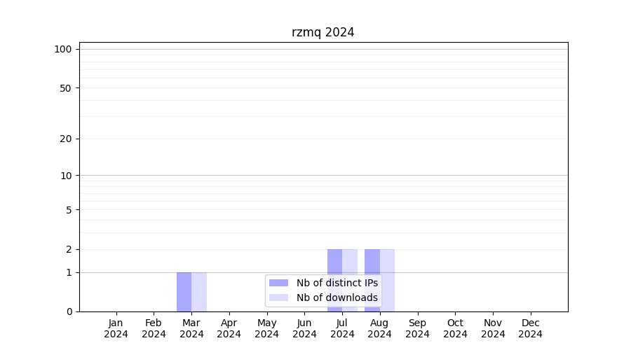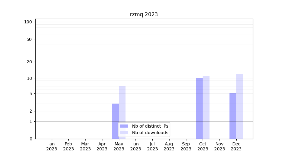 Number of downloads for experiment package rzmq, year by year, from 2025 back to 2014 (years with no downloads are omitted):