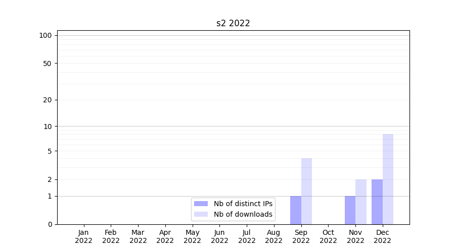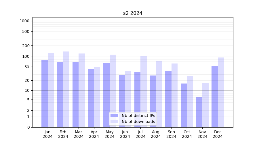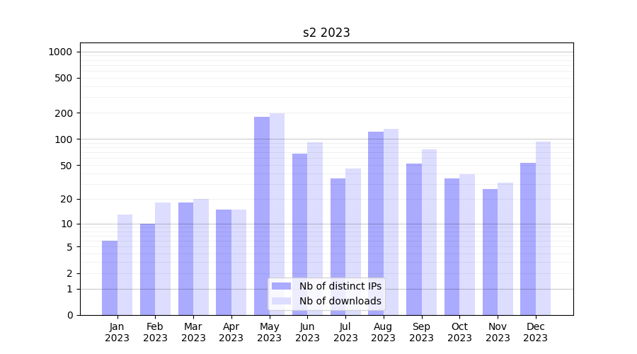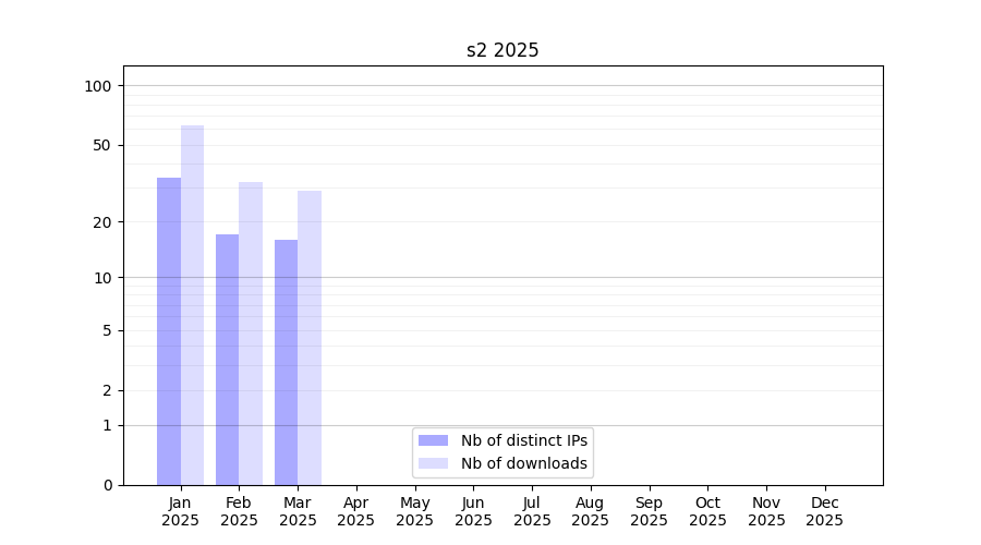 Number of downloads for experiment package s2, year by year, from 2025 back to 2014 (years with no downloads are omitted):