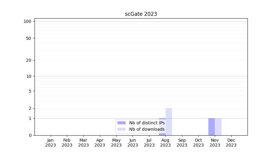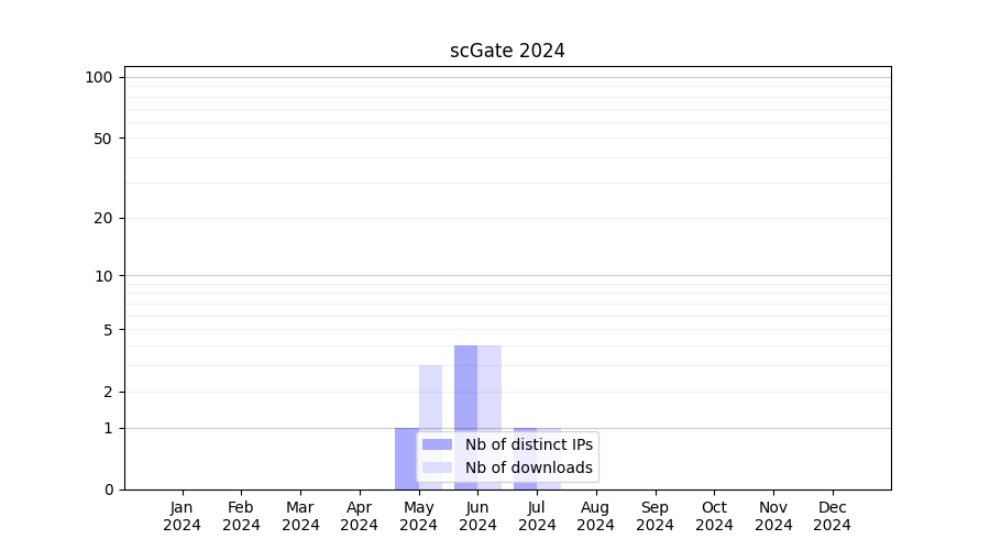 Number of downloads for experiment package scGate, year by year, from 2025 back to 2014 (years with no downloads are omitted):