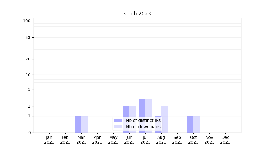 Number of downloads for experiment package scidb, year by year, from 2025 back to 2014 (years with no downloads are omitted):