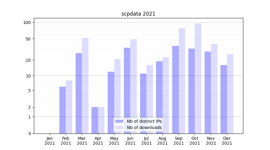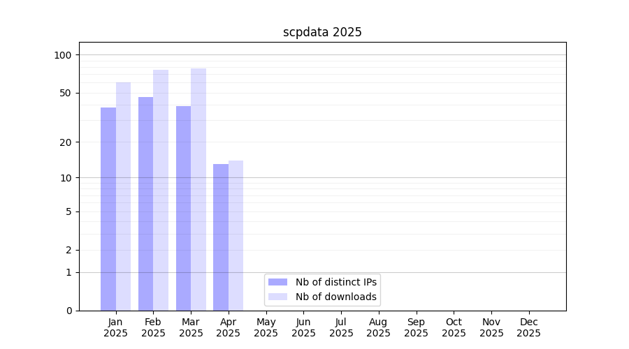 Number of downloads for experiment package scpdata, year by year, from 2025 back to 2014 (years with no downloads are omitted):