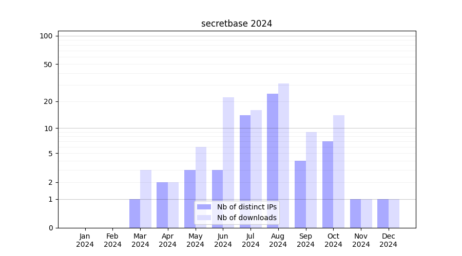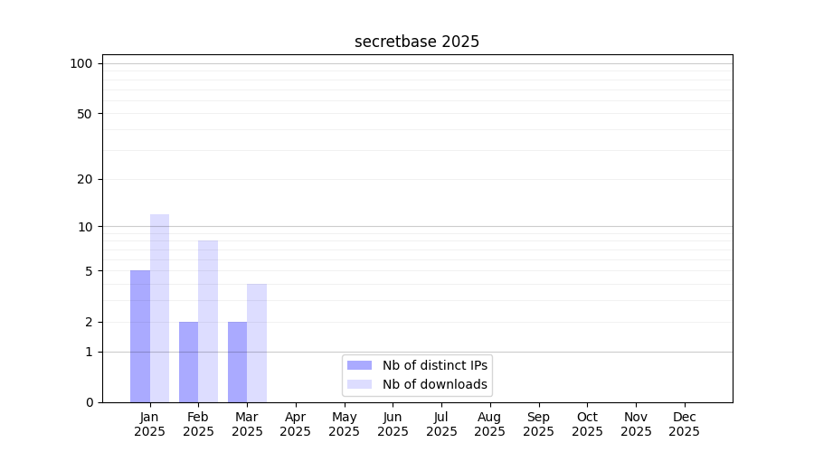 Number of downloads for experiment package secretbase, year by year, from 2025 back to 2014 (years with no downloads are omitted):