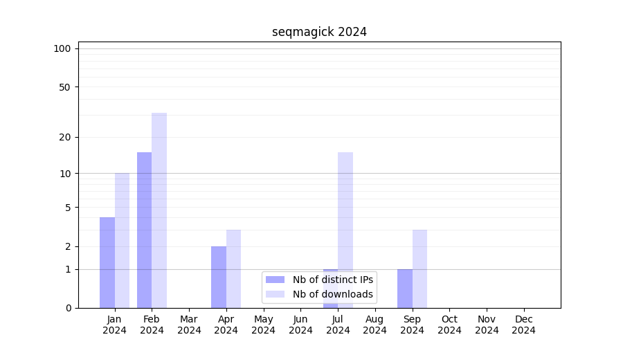 Number of downloads for experiment package seqmagick, year by year, from 2025 back to 2014 (years with no downloads are omitted):