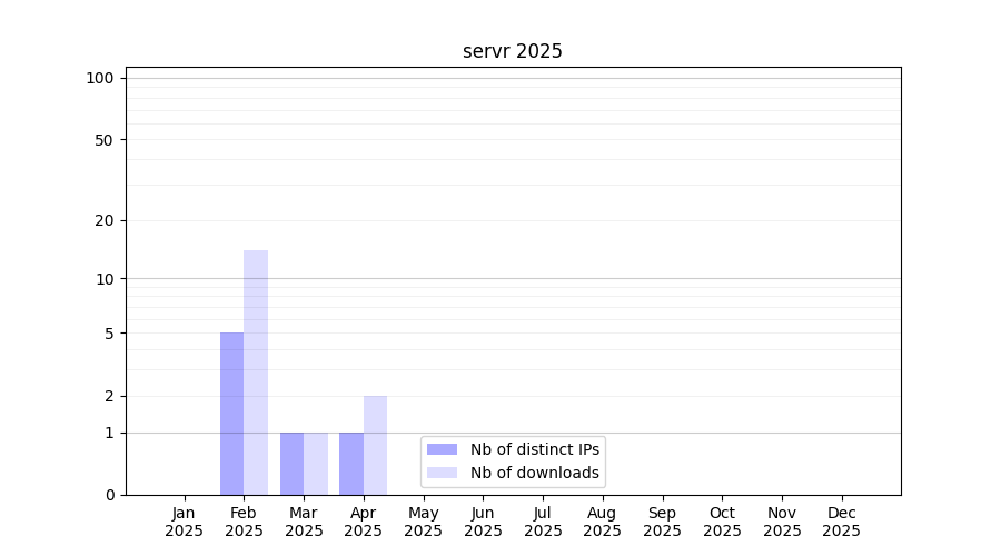 Number of downloads for experiment package servr, year by year, from 2025 back to 2014 (years with no downloads are omitted):