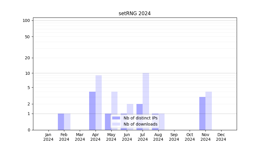 Number of downloads for experiment package setRNG, year by year, from 2025 back to 2014 (years with no downloads are omitted):
