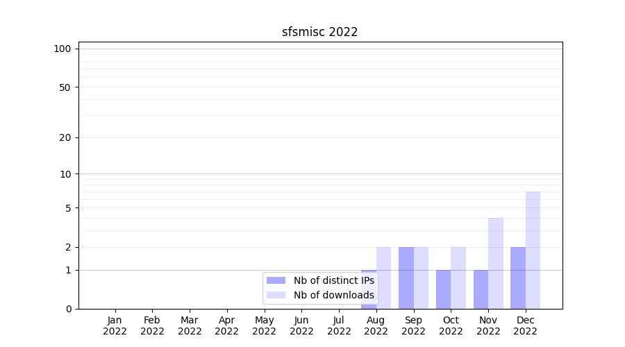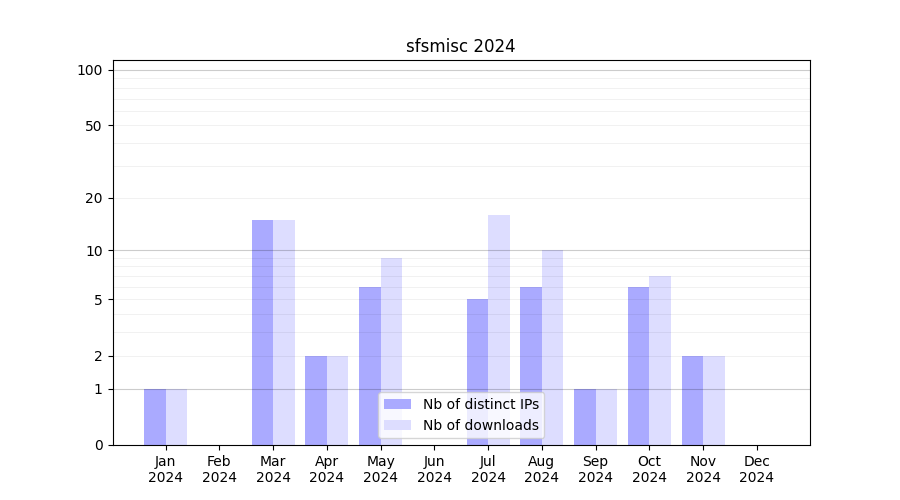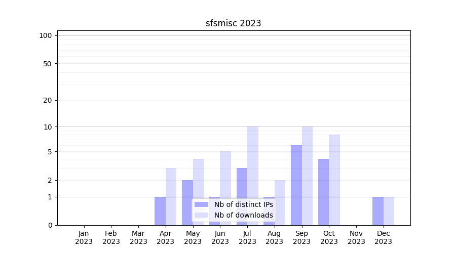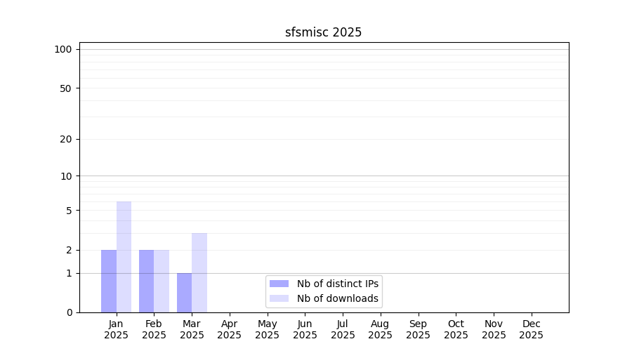 Number of downloads for experiment package sfsmisc, year by year, from 2025 back to 2014 (years with no downloads are omitted):