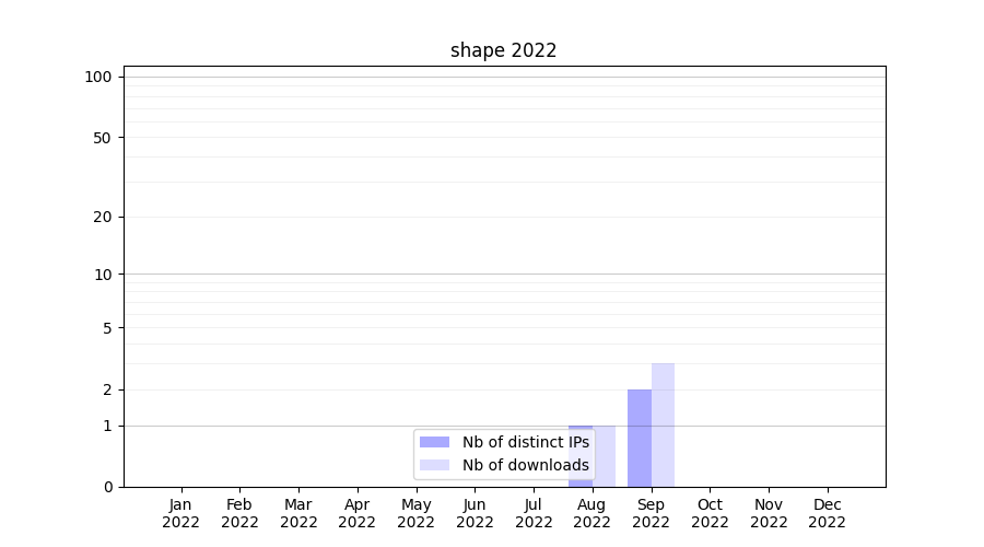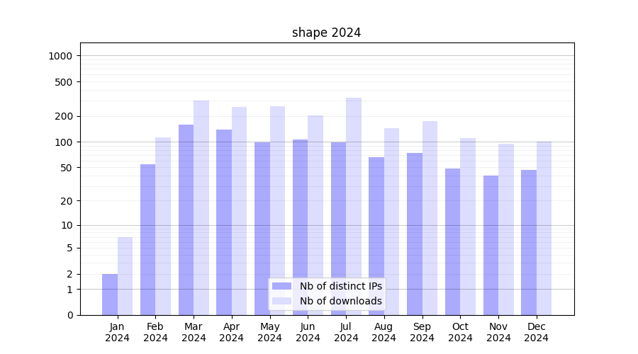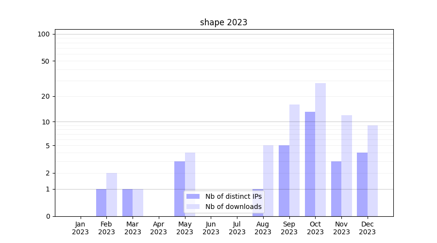 Number of downloads for experiment package shape, year by year, from 2025 back to 2014 (years with no downloads are omitted):