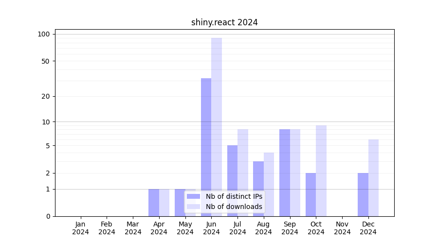 Number of downloads for experiment package shiny.react, year by year, from 2025 back to 2014 (years with no downloads are omitted):