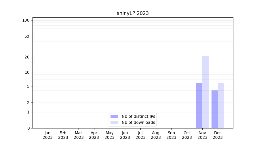 Number of downloads for experiment package shinyLP, year by year, from 2025 back to 2014 (years with no downloads are omitted):