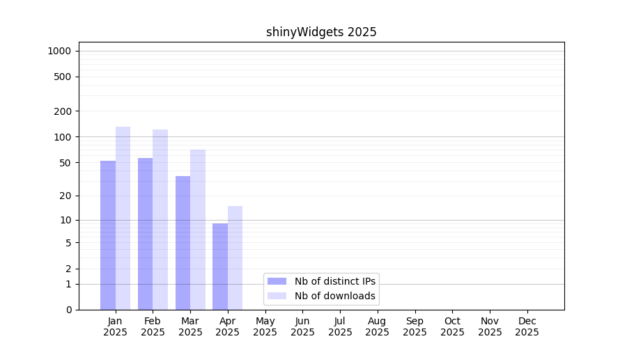 Number of downloads for experiment package shinyWidgets, year by year, from 2025 back to 2014 (years with no downloads are omitted):