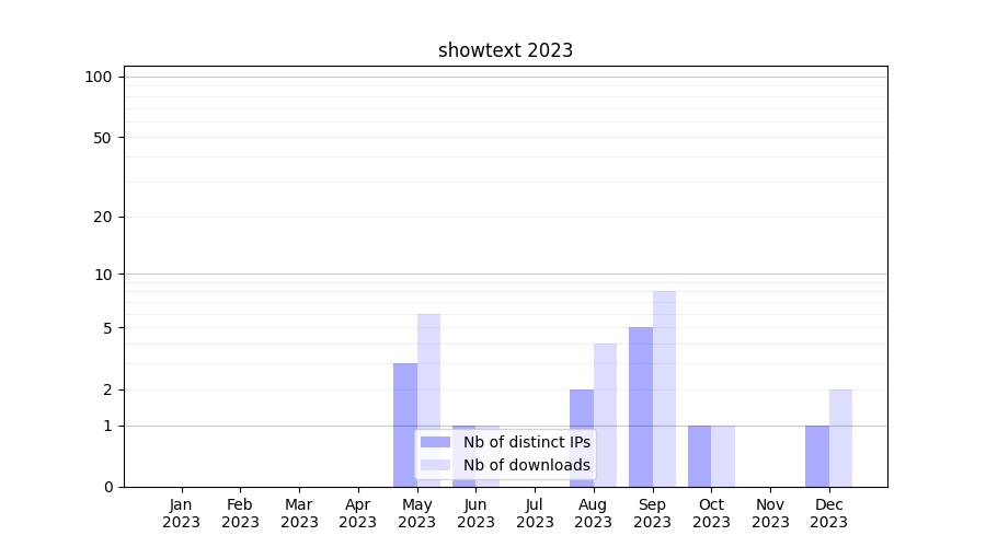 Number of downloads for experiment package showtext, year by year, from 2025 back to 2014 (years with no downloads are omitted):