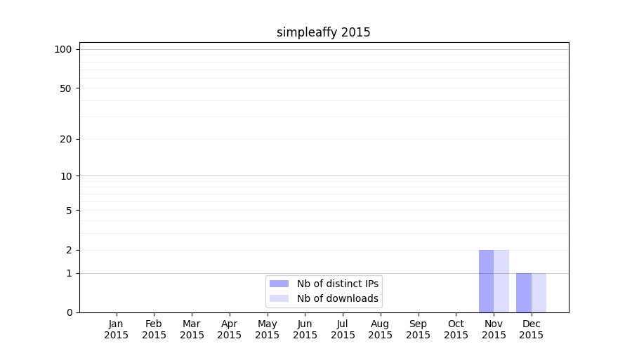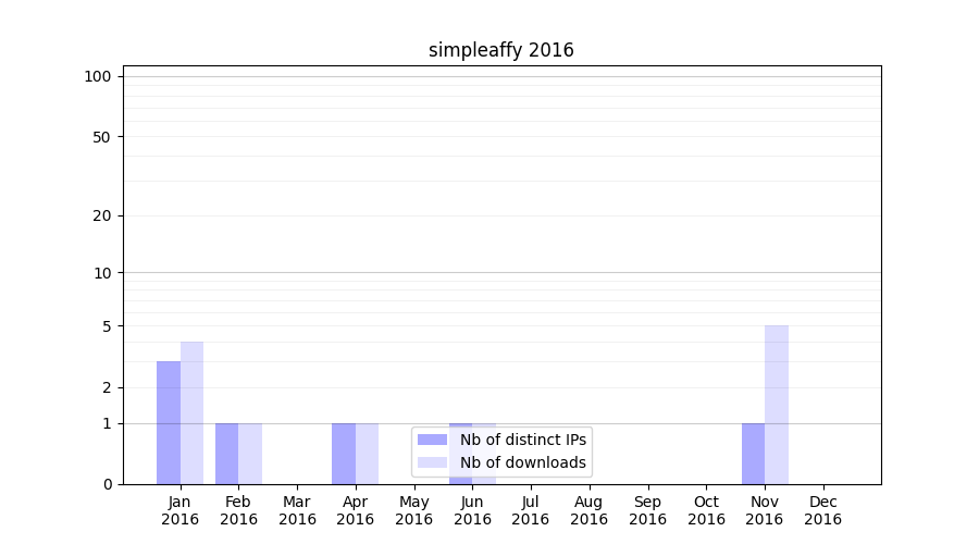 Number of downloads for experiment package simpleaffy, year by year, from 2025 back to 2014 (years with no downloads are omitted):