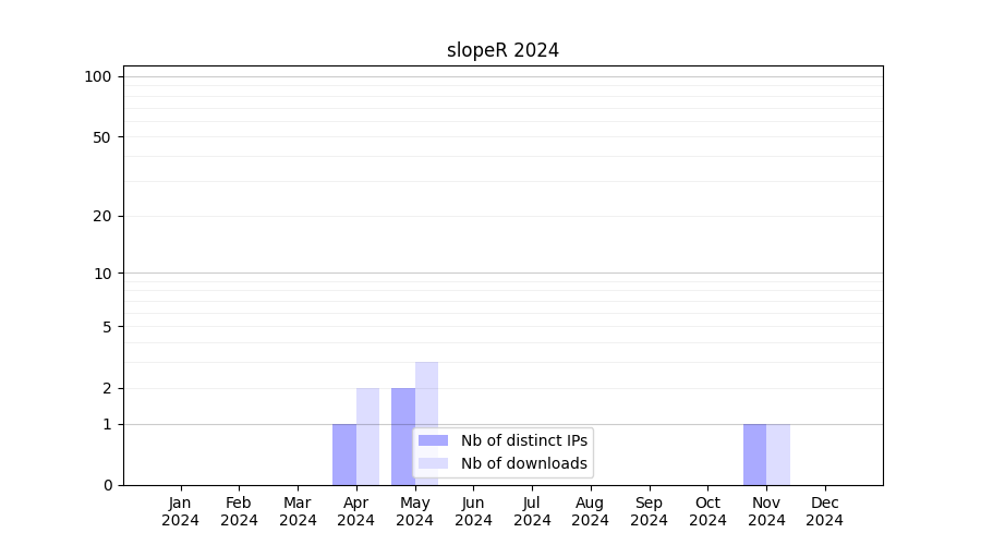 Number of downloads for experiment package slopeR, year by year, from 2025 back to 2014 (years with no downloads are omitted):