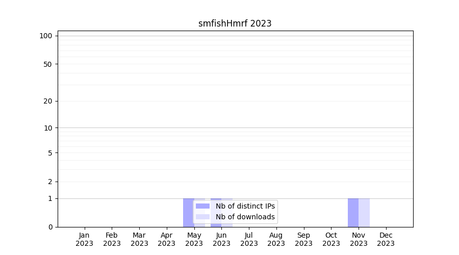 Number of downloads for experiment package smfishHmrf, year by year, from 2025 back to 2014 (years with no downloads are omitted):