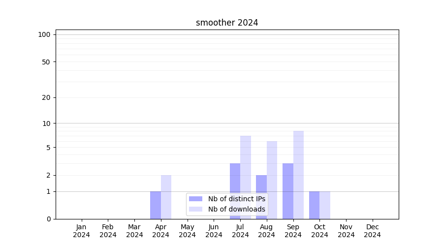 Number of downloads for experiment package smoother, year by year, from 2025 back to 2014 (years with no downloads are omitted):